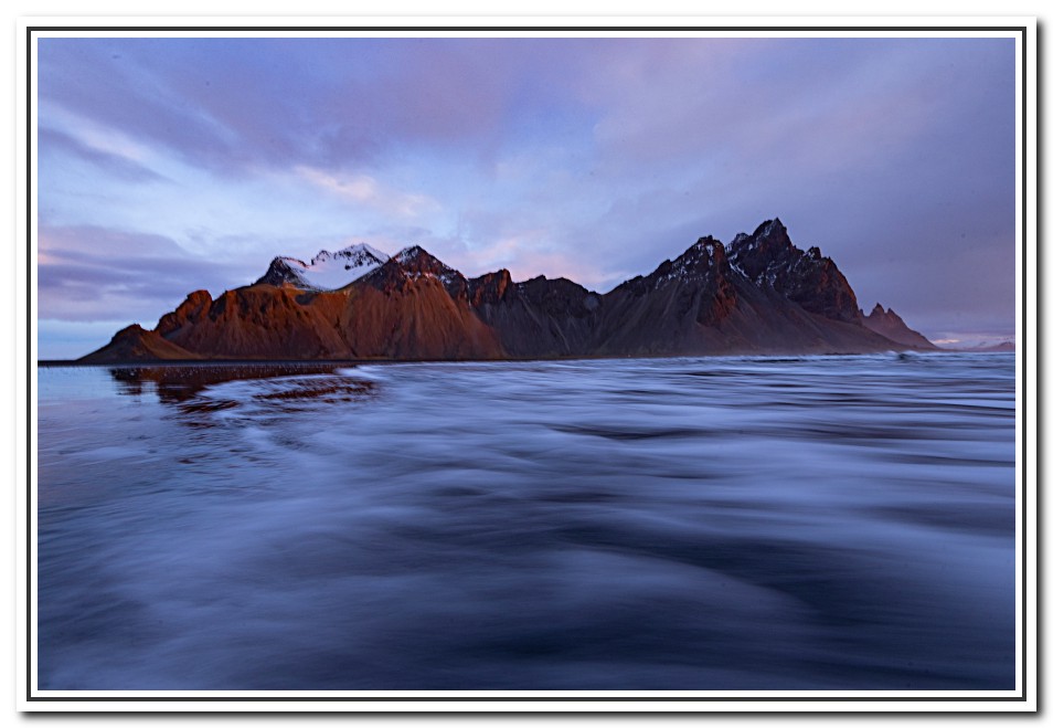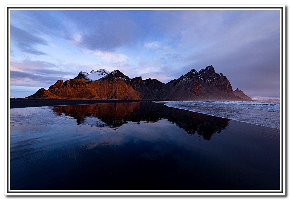 Monte Vestrahorn e la spiaggia di Stokksnes con le luci dell'alba