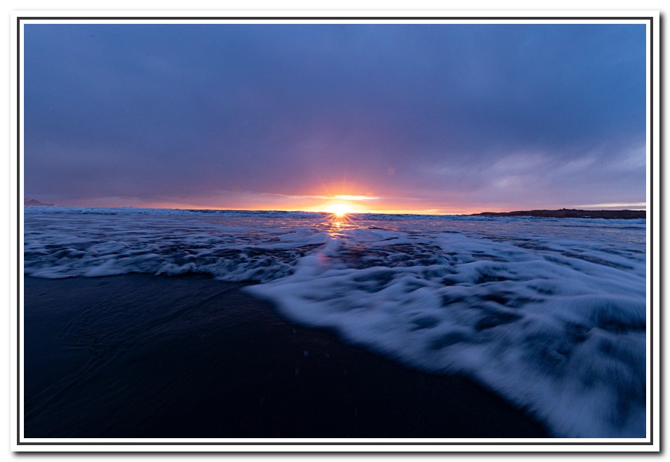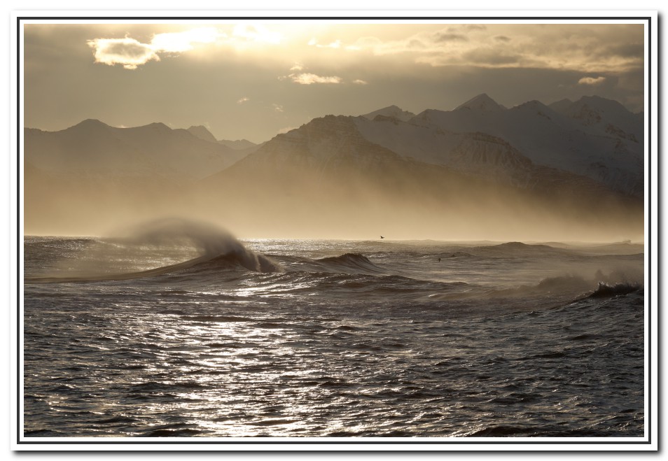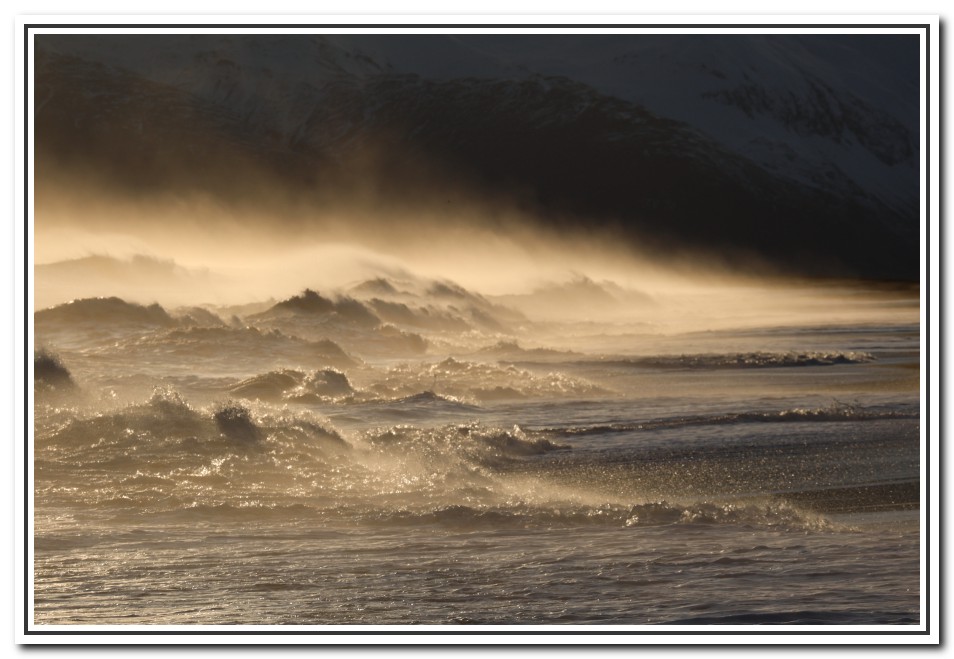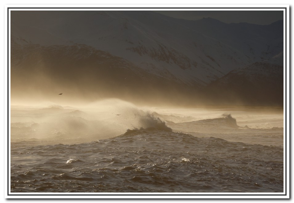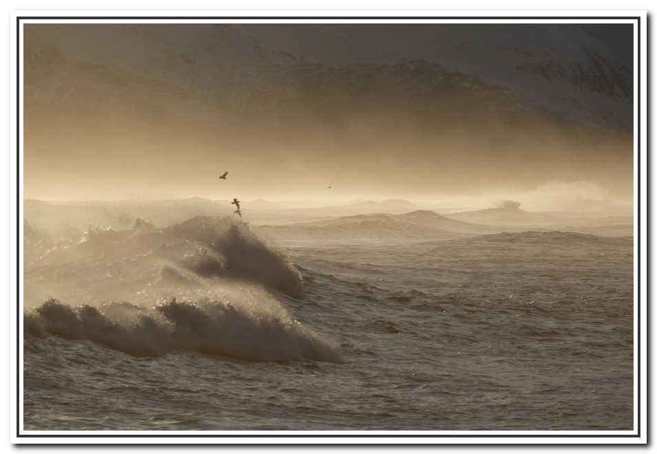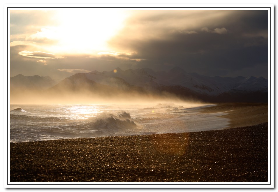 lo spettacolo impetuoso delle onde fra foschia, nuvole, gabbiani e la luce al tramonto (Hvalnes beach)